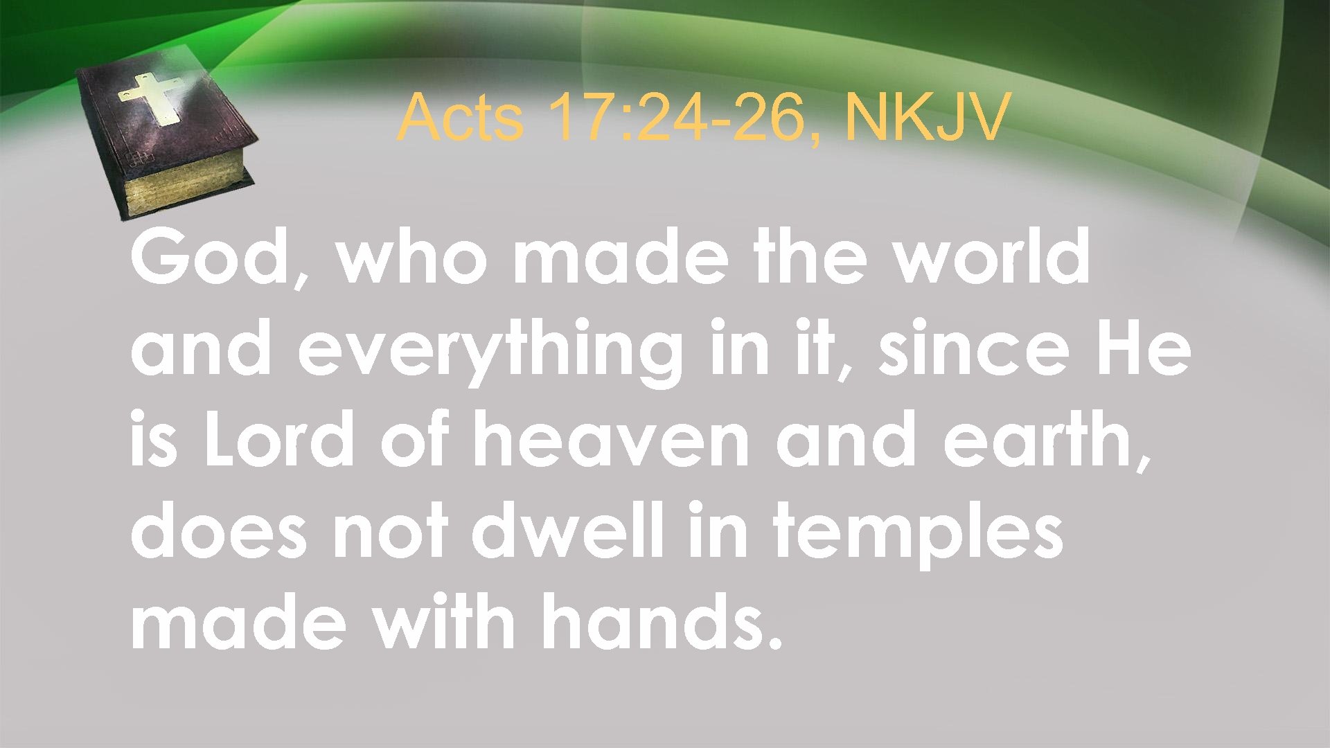 Acts 17: 24 -26, NKJV God, who made the world and everything in it, since He is Lord of heaven and earth, does not dwell in temples made with hands.