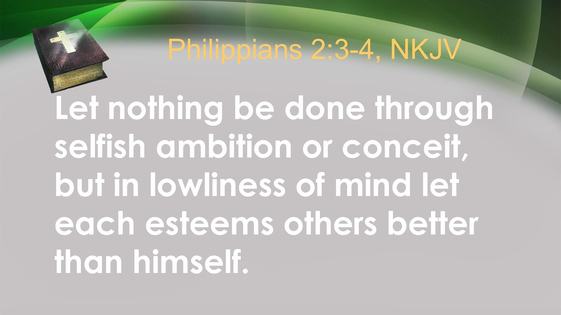 Philippians 2: 3 -4, NKJV Let nothing be done through selfish ambition or conceit, but in lowliness of mind let each esteems others better than himself.