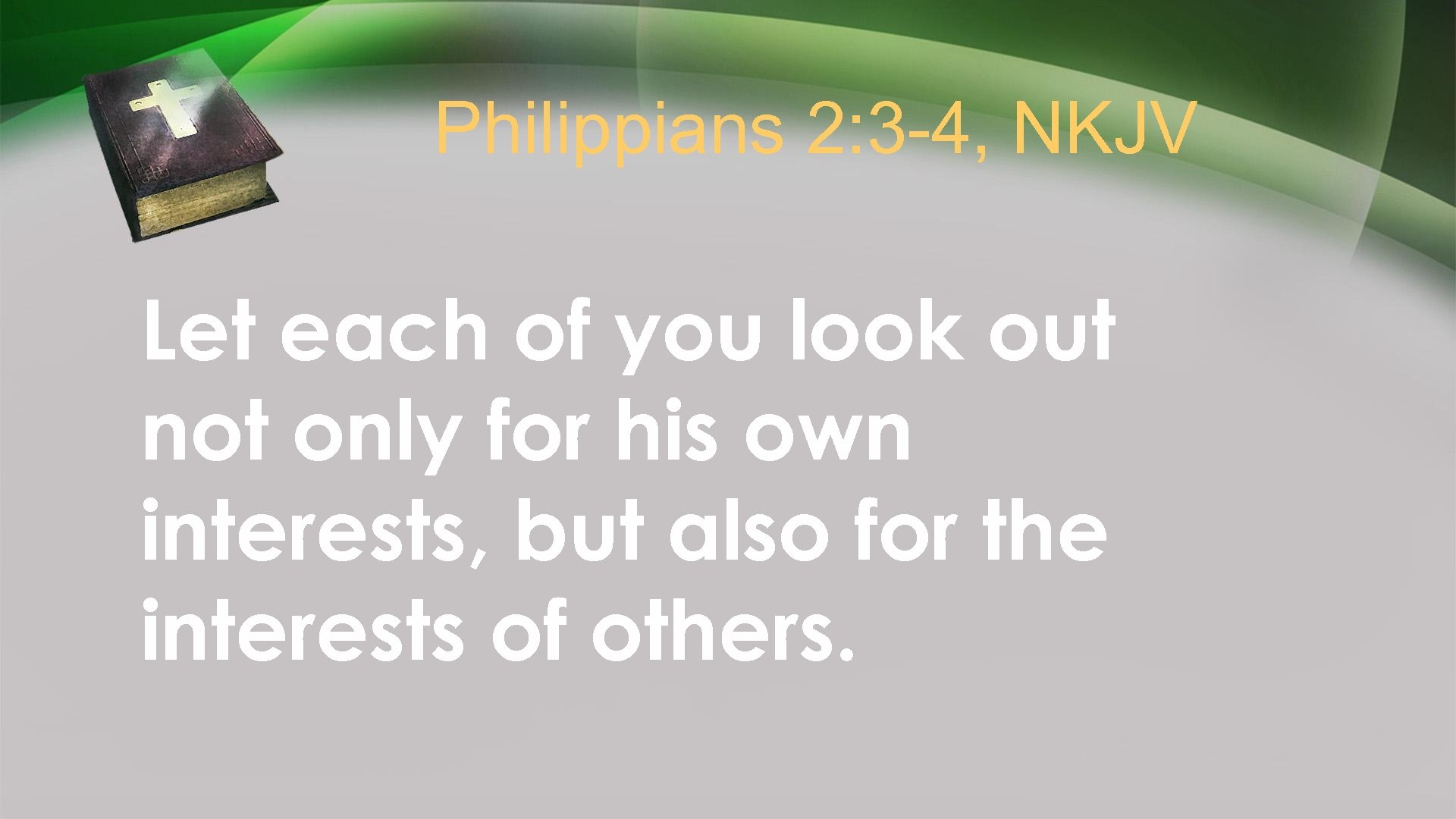 Philippians 2: 3 -4, NKJV Let each of you look out not only for his own interests, but also for the interests of others.