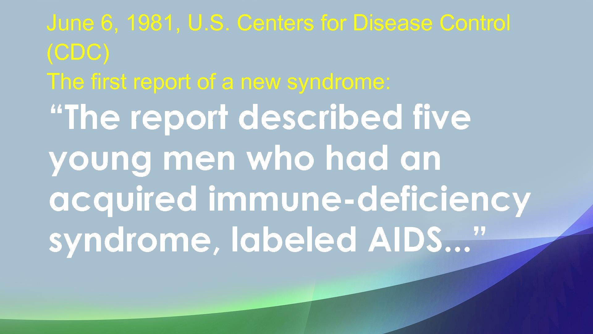 June 6, 1981, U. S. Centers for Disease Control (CDC) The first report of a new syndrome: “The report described five young men who had an acquired immune-deficiency syndrome, labeled AIDS. . . ”