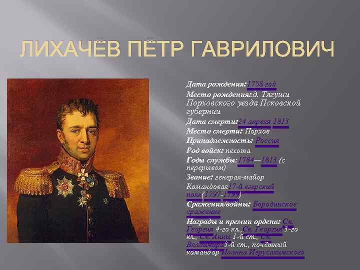 ЛИХАЧЁВ ПЁТР ГАВРИЛОВИЧ Дата рождения: 1758 год Место рождения: д. Тягуши д. Порховского уезда Псковской губернии Дата смерти: 24 апреля 1813 Место смерти: Порхов Принадлежность: Россия Род войск: пехота Годы службы: 1784— 1813 (с перерывом) Звание: генерал-майор Командовал 17 -й егерский полк(1797 -1799) Сражения/войны: Бородинское сражение Награды и премии ордена: Св. Георгия 4 -го кл. , Св. Георгия 3 -го кл. , Св. Анны 1 -й ст. , Св. Владимира 3 -й ст. , почётный командор Иоанна Иерусалимского