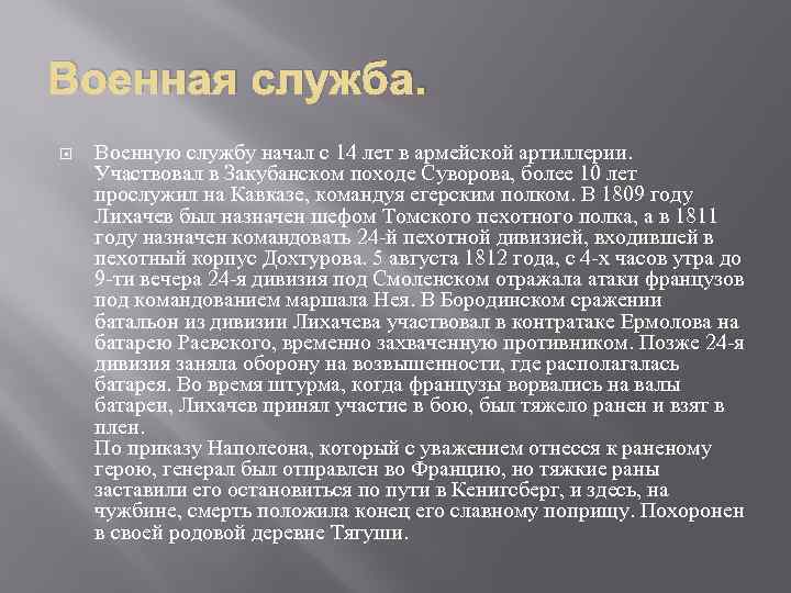 Краткая биография. Петр Гаврилович был боевым генералом (1758 - 1812). В 1783 г. участвовал с отличием в закубанском походе Суворова , в 1788 - 1790 годах в шведской войне. С 1797 г. , командуя полком, принял участие в ряде походов в Кабарде и Дагестане, в которых обнаружил неустрашимость, инициативу и быстроту в военных действиях против горцев. В Отечественную войну Лихачев командовал дивизией, с которою принял участие в обороне Смоленска, а в Бородинском сражении в защите батареи Раевского. Когда французы ворвались на батарею, Лихачев, во главе немногих ее защитников, бросился с обнаженною шпагой на неприятеля. Исколотый штыками, еле живой, был взят в плен, где скоро умер.