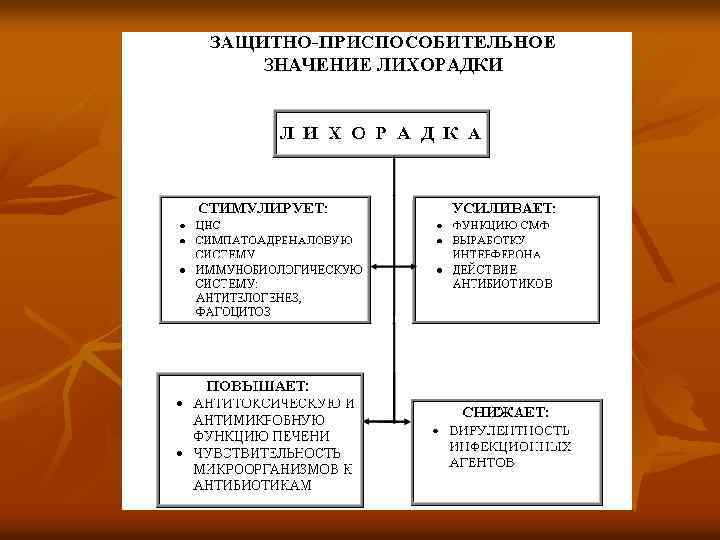 Принципы терапии лихорадки n Патогенетическая терапия: n n n торможение продукции и уменьшение эффектов действия веществ, образующихся в нейронах центра терморегуляции под влиянием лейкоцитарных цитокинов, Пг. Е, ц. АМФ, подавление интенсивности окислительных реакций, увеличение реакций теплоотдачи.
