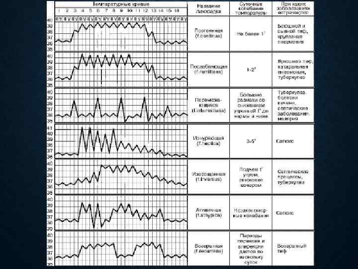 ОСОБЕННОСТИ ТЕМПЕРАТУРНОЙ КРИВОЙ • Волнообразная лихорадка (f. undulans) проявляется постепенным нарастанием температуры изо дня в день до высоких цифр с последующим постепенным ее снижением с формированием волновых колебаний