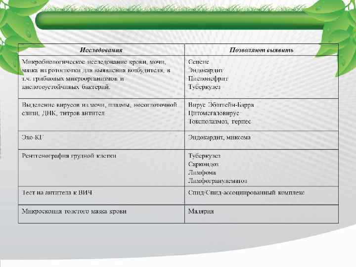 ВИЧ-ассоциированной ЛНГ • температура тела 38, 3 С при нескольких измерениях, • безрезультатном обследовании на протяжении более 4 нед амбулаторно или 3 дней в условиях стационара (включая инкубацию микробиологической культуры минимум 2 дня) • и доказанном инфицировании ВИЧ. • В этой группе пациентов ВИЧ-инфекция сама может быть причиной лихорадки.