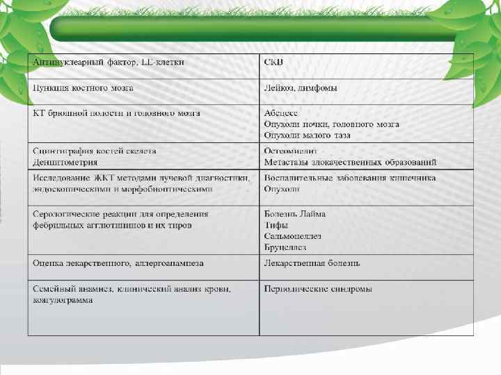 Дополнительные исследования Неинвазивные инструментальные v R – графия придаточных пазух носа v КТ или МРТ головы v ЭХО – КГ v Допплеровское исследование вен ног v R – контрастное исследование верхних отделов ЖКТ и ирригоскопия v КТ или МРТ брюшной полости и малого таза v Экскреторная урография v Обзорная R – графия костей v Дополнительные исследования Инвазивные инструментальные v Биопсия кожи v Биопсия печени v Трепанобиопсия подвздошной кости v Биопсия лимфоузлов v Исследование плеврального, перикардиального, суставного выпота, асцитической жидкости v Люмбальная пункция