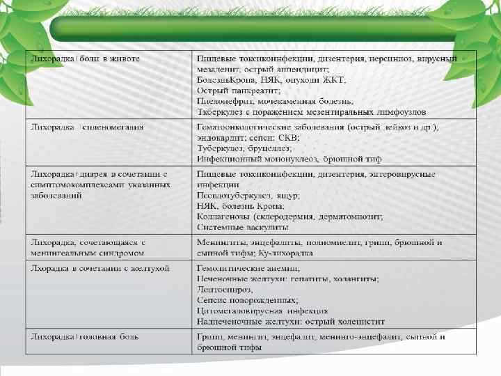 Лихорадка, сопровождающаяся геморрагическими высыпаниями Острый лейкоз; геморрагические лихорадки; острая форма гистиоцитоза Х; инфекционный эндокардит; менингококковая инфекция; синдром Уотерхауса-Фридериксена; . Тромбоцитопеническая пурпура; гипопластическая анемии; геморрагический васкулит Лихорадка+узловатая эритема Узловатая эритема как самостоятельное заболевание; саркоидоз, туберкулез, болезнь Крона Лихорадка и локальное увеличение периферических лимфоузлов в сочетании с симптомокомплексами указанных заболеваний Лимфаденит, рожистое воспаление, заглоточный абсцесс, дифтерия зева, скарлатина, туляремия, болезнь кошачьей царапины, синдром Капоши Лихорадка с генерализованным увеличением лимфоузлов Вирусные инфекции: краснуха, ветряная оспа, энтеровирусные инфекции, аденовирусные инфекции, инфекционный мононуклеоз Бактериальные инфекции: листериоз, туберкулез; Заболевания, вызванные простейшими: лейшманиоз, токсоплазмоз; Болезнь Кавасаки; Злокачественные лимфомы