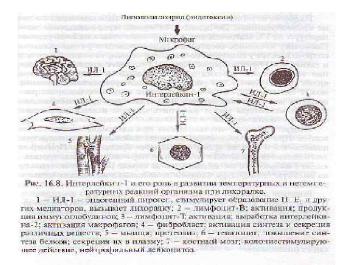 • После попадания в организм первичных пирогенов, в организме начинается выработка вторичных пирогенов. Наиболее ключевой представитель – интерлейкин – 1 (ИЛ 1): полипептид, циркулирующий в крови ИЛ 1 имеет целый ряд мишеней, в том чиле и гипоталамус. Под влиянием ИЛ 1 (активация фосфолипазы А 2 – образование арахидоновой кислоты) на уровне мозговых артериол и капилляров образуются простагландины Е 1 и Е 2 (медиаторы лихорадки), которые воздействуют на центр терморегуляции. Изменяют в нейронах активность фермента фосфодиэстеразы, что сопровождается повышением содержания ц АМФ. Изменяется порог чувствительности «тепловых» (возбудимость снижается) и «холодовых» (возбудимость повышается) нейронов. Меняется «установочная точка» центра и температура тела за счет изменения процессов теплопродукции и теплоотдачи устанавливается на более высоком уровне.