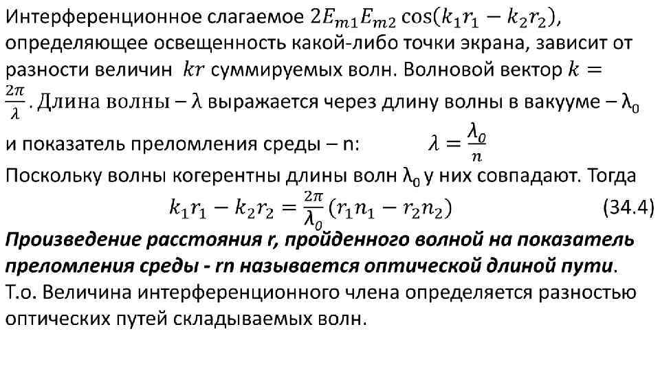 Напомним физическую модель. Две когерентные волны от источников S 1 и S 2 распространяются в одном пространстве. Рассмотрим результат их сложения в точке Р. Световой вектор Е запишется в виде суммы уравнений волн: