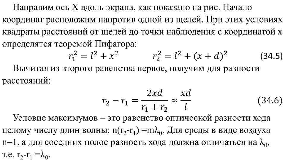 В точках экрана, где эта разность равна нулю или целому числу длин волн λ 0, будет интерференционный максимум освещенности. В точках экрана, где оптическая разность хода равна нечетному числу полуволн, наблюдается минимум освещенности. Формирование когерентных волн. Излучение двух независимых источников никогда не будут когерентными. Атомы нагретого вещества излучают свет отдельными волновыми порциями – цугами. Длительность цуга составляет около 10 -8 с. За это время свет успевает пройти расстояние около 3 м. Оно называется длиной когерентности. Для получения интерференционной картины необходимо сложить волны одного цуга. Это достигается путем пропускания светового потока через узкую щель, деления полученной световой волны на два потока, проходящих различные оптические пути, и последующего наложение их друг на друга.