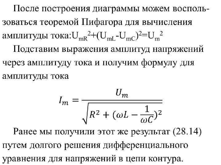 Из векторной диаграммы легко определить и разность начальных фаз напряжения u тока в контуре. Разумеется будет получен тот же результат, который дается формулами (28. 14). Пятиминутка. Цепь из последовательно соединенных резистора 100 Ом и конденсатора 40 мкф подключена к сети переменного напряжения 220 В, 50 Гц. Используя метод векторных диаграмм, определить действующее значение тока в цепи.