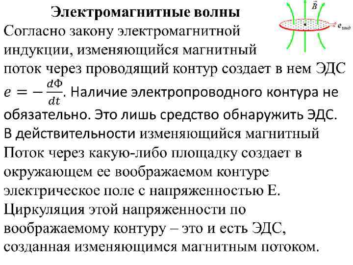 На рисунке показаны линии индукции изменяющегося магнитного поля и накручивающиеся на них линии напряженности электрического поля, порожденного изменением магнитного поля. Как же быть с теоремой о циркуляции напряженности электрического поля и с утверждением, что линии напряженности начинаются и заканчиваются на зарядах, создающих поле? Эти теоремы справедливы только для неизменных во времени полей. Для переменных полей они не верны.
