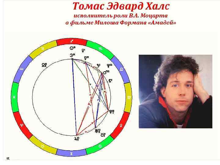 • • • Описание– энергетический темперамент Стрелец и по Солнцу, и по синтетическому знаку схож с внешним образом человека. Это Кентавр с луком и стрелами, несущийся вперед. Неисчерпаемый оптимизм и жизнерадостность, человек открытый, яркая внешность, излучает энтузиазм и обаяние. На него невозможно обижаться. Прирожденный лидер, всегда стремится вперед, к вершинам, это видно из биографии, когда поставил себе амбициозную цель стать великим актером. Свободолюбие и независимость – недаром в детстве ушел из дома, поздно женился. Склонность к риску, авантюрам, приключениям. Чрезмерная гордость. Все эти качества помогли ему так ярко сыграть роль Моцарта в фильме «Амадей» . Преобладающая стихия Огонь – характеризуется активными действиями, сильными чувствами, яркая мимика и жесты, задор, азарт, улыбка заражает, что невозможно не заметить в фильме Амадей Отсутствие Земли в карте (как у самого Моцарта) – мечтатель, витает в облаках, непрактичен, хватается за много разных дел, это прослеживается в его биографии – то играл в театре, то на Бродвее, то занимался озвучкой фильмов, то продюсированием, не мог найти себя Мутабельный крест – подвижность, гибкость, умение заниматься несколькими делами одновременно, легко переключаться с одной деятельности на другую, любовь к разнообразию Преобладание сенситивных знаков – эмоциональность, восприимчивость, чувствительность Преобладание мужских знаков – сильный характер, целеустремленность, инициативность