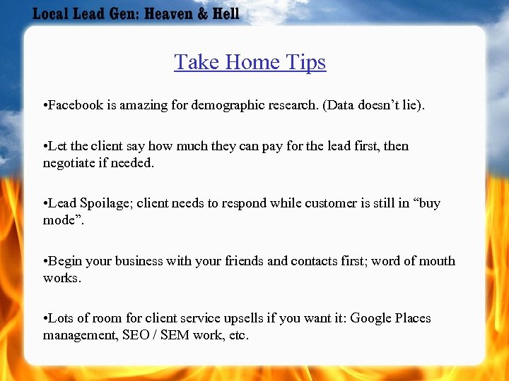 Take Home Tips • Facebook is amazing for demographic research. (Data doesn’t lie). • Let the client say how much they can pay for the lead first, then negotiate if needed. • Lead Spoilage; client needs to respond while customer is still in “buy mode”. • Begin your business with your friends and contacts first; word of mouth works. • Lots of room for client service upsells if you want it: Google Places management, SEO / SEM work, etc.