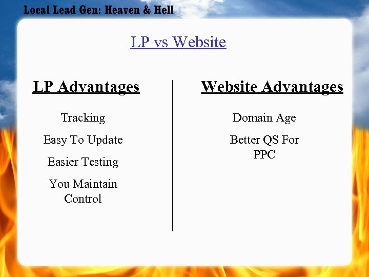 LP vs Website LP Advantages Website Advantages Tracking Domain Age Easy To Update Better QS For PPC Easier Testing You Maintain Control