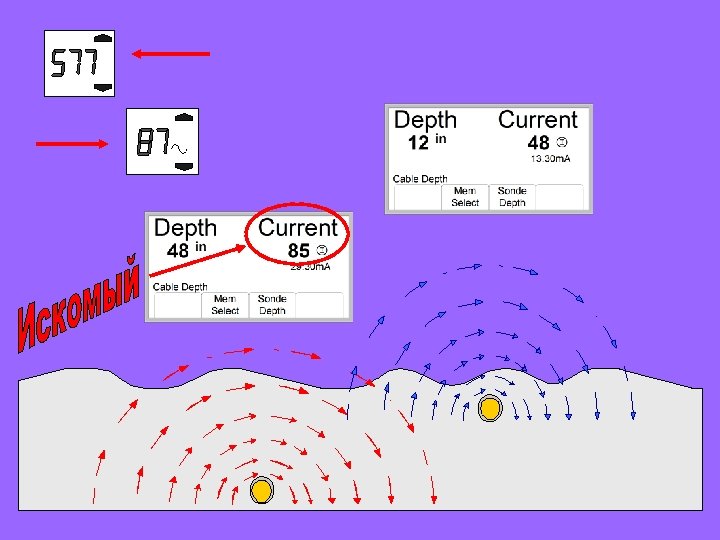 Оценка глубины и тока Dynatel 2273 M Cable/Pipe/Fault Locator TM TM 57. 9 Cable Locate 577 Dir Pk Freq Mode Depth 14 in d. B Depth 60% Off Alert Current 78. 2 29. 30 m. A Cable Depth Recall Save Memory Clear All Sonde Depth Menu On/Off Locate Spkr/Xpand Gain Adjust Ok Примечание: Menu On/Off Locate Spkr/Xpand Gain Adjust Ok Кабель на меньшей глубине будет иметь более сильный сигнал, чем глубоко закопанный… оцените глубину… и сравните ток в кабеле на выходе генератора с показаниями относительного тока на