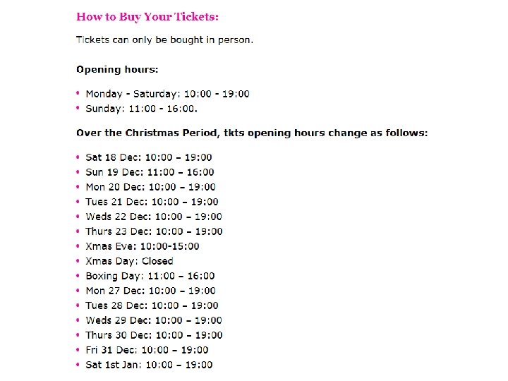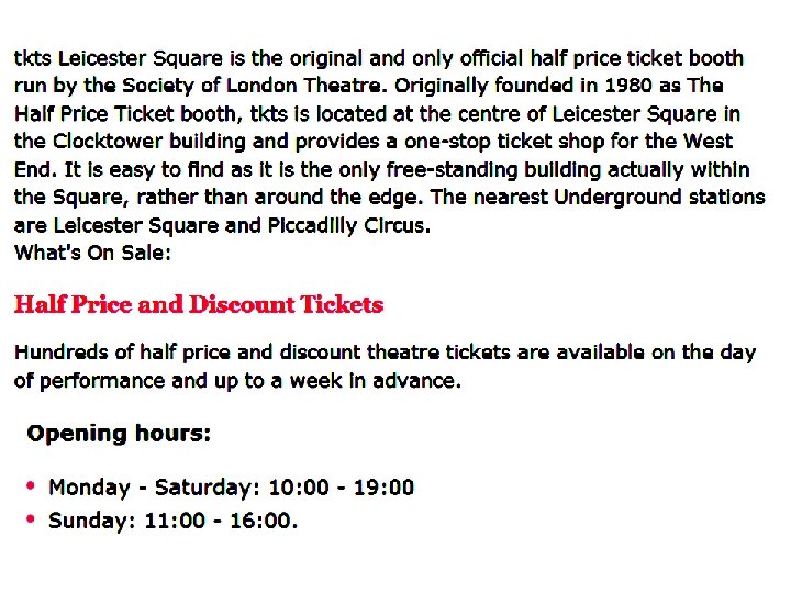 1. London is one of Europe‘s largest cities. 2. For travelling the Tube buy yourself a travel card or an Oyster card. • Travelling with the Oyster card is quicker, cheaper, and easier. • The underground is better known as the tube. • The tube transports over one billion peole around the city every year. 3. Many of the world‘s landmarks are here. • Buckingham Palace, Tower Bridge, Trafalgar Square, Big Ben are just some of the landmarks. 4. The citie‘s top museums and galleries are free. • These include the Natural History Museum, Victoria and Albert Museum, and the Science Museum. • They are side by side on Exhibition Road. • The National Gallery is on Trafalgar Square.