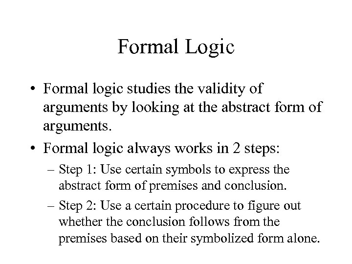 Formal Logic • Formal logic studies the validity of arguments by looking at the abstract form of arguments. • Formal logic always works in 2 steps: – Step 1: Use certain symbols to express the abstract form of premises and conclusion. – Step 2: Use a certain procedure to figure out whether the conclusion follows from the premises based on their symbolized form alone.