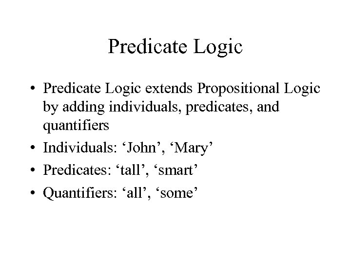 Predicate Logic • Predicate Logic extends Propositional Logic by adding individuals, predicates, and quantifiers • Individuals: ‘John’, ‘Mary’ • Predicates: ‘tall’, ‘smart’ • Quantifiers: ‘all’, ‘some’