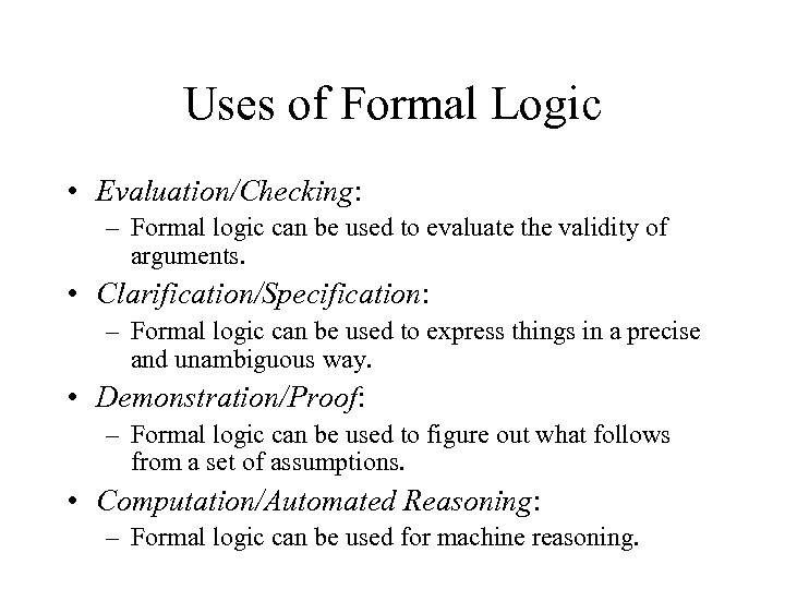 Uses of Formal Logic • Evaluation/Checking: – Formal logic can be used to evaluate the validity of arguments. • Clarification/Specification: – Formal logic can be used to express things in a precise and unambiguous way. • Demonstration/Proof: – Formal logic can be used to figure out what follows from a set of assumptions. • Computation/Automated Reasoning: – Formal logic can be used for machine reasoning.