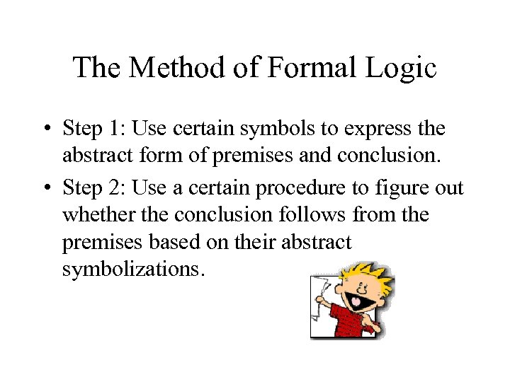The Method of Formal Logic • Step 1: Use certain symbols to express the abstract form of premises and conclusion. • Step 2: Use a certain procedure to figure out whether the conclusion follows from the premises based on their abstract symbolizations.