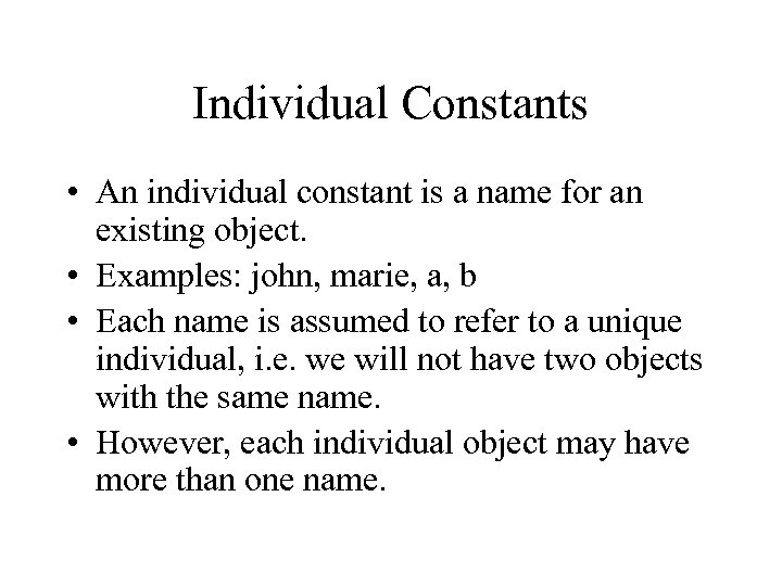 Individual Constants • An individual constant is a name for an existing object. • Examples: john, marie, a, b • Each name is assumed to refer to a unique individual, i. e. we will not have two objects with the same name. • However, each individual object may have more than one name.