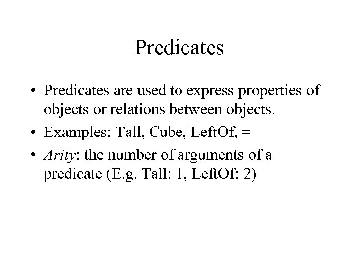 Predicates • Predicates are used to express properties of objects or relations between objects. • Examples: Tall, Cube, Left. Of, = • Arity: the number of arguments of a predicate (E. g. Tall: 1, Left. Of: 2)