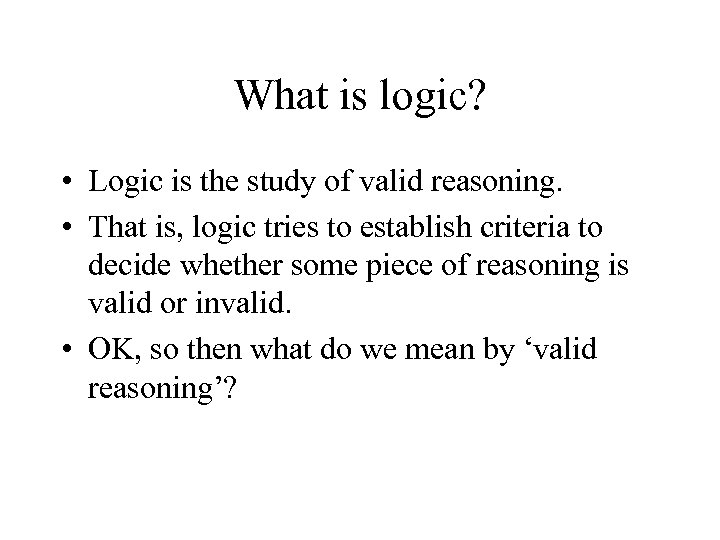 What is logic? • Logic is the study of valid reasoning. • That is, logic tries to establish criteria to decide whether some piece of reasoning is valid or invalid. • OK, so then what do we mean by ‘valid reasoning’?