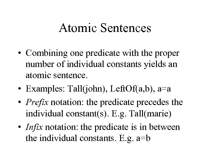 Atomic Sentences • Combining one predicate with the proper number of individual constants yields an atomic sentence. • Examples: Tall(john), Left. Of(a, b), a=a • Prefix notation: the predicate precedes the individual constant(s). E. g. Tall(marie) • Infix notation: the predicate is in between the individual constants. E. g. a=b