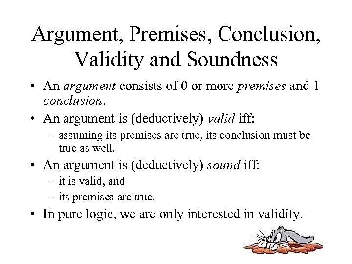 Argument, Premises, Conclusion, Validity and Soundness • An argument consists of 0 or more premises and 1 conclusion. • An argument is (deductively) valid iff: – assuming its premises are true, its conclusion must be true as well. • An argument is (deductively) sound iff: – it is valid, and – its premises are true. • In pure logic, we are only interested in validity.