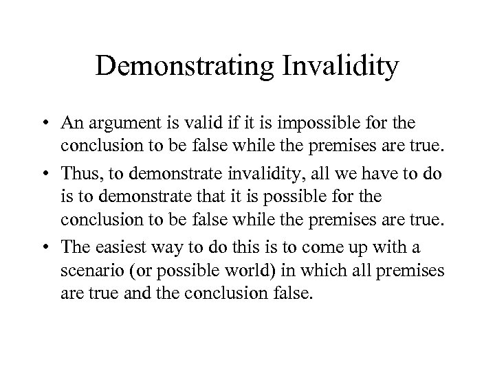 Demonstrating Invalidity • An argument is valid if it is impossible for the conclusion to be false while the premises are true. • Thus, to demonstrate invalidity, all we have to do is to demonstrate that it is possible for the conclusion to be false while the premises are true. • The easiest way to do this is to come up with a scenario (or possible world) in which all premises are true and the conclusion false.