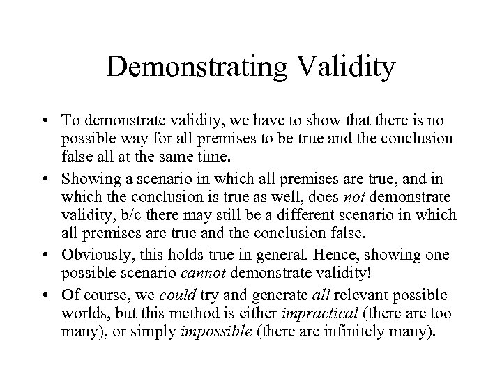 Demonstrating Validity • To demonstrate validity, we have to show that there is no possible way for all premises to be true and the conclusion false all at the same time. • Showing a scenario in which all premises are true, and in which the conclusion is true as well, does not demonstrate validity, b/c there may still be a different scenario in which all premises are true and the conclusion false. • Obviously, this holds true in general. Hence, showing one possible scenario cannot demonstrate validity! • Of course, we could try and generate all relevant possible worlds, but this method is either impractical (there are too many), or simply impossible (there are infinitely many).