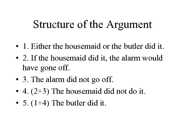 Structure of the Argument • 1. Either the housemaid or the butler did it. • 2. If the housemaid did it, the alarm would have gone off. • 3. The alarm did not go off. • 4. (2+3) The housemaid did not do it. • 5. (1+4) The butler did it.