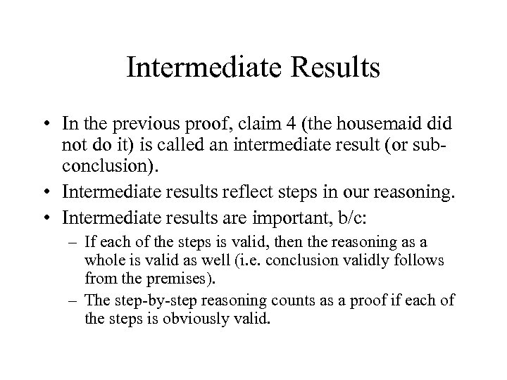 Intermediate Results • In the previous proof, claim 4 (the housemaid did not do it) is called an intermediate result (or subconclusion). • Intermediate results reflect steps in our reasoning. • Intermediate results are important, b/c: – If each of the steps is valid, then the reasoning as a whole is valid as well (i. e. conclusion validly follows from the premises). – The step-by-step reasoning counts as a proof if each of the steps is obviously valid.