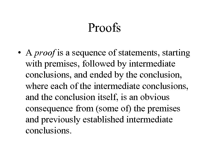 Proofs • A proof is a sequence of statements, starting with premises, followed by intermediate conclusions, and ended by the conclusion, where each of the intermediate conclusions, and the conclusion itself, is an obvious consequence from (some of) the premises and previously established intermediate conclusions.