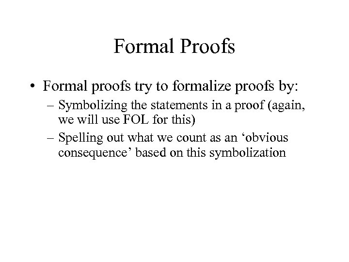 Formal Proofs • Formal proofs try to formalize proofs by: – Symbolizing the statements in a proof (again, we will use FOL for this) – Spelling out what we count as an ‘obvious consequence’ based on this symbolization