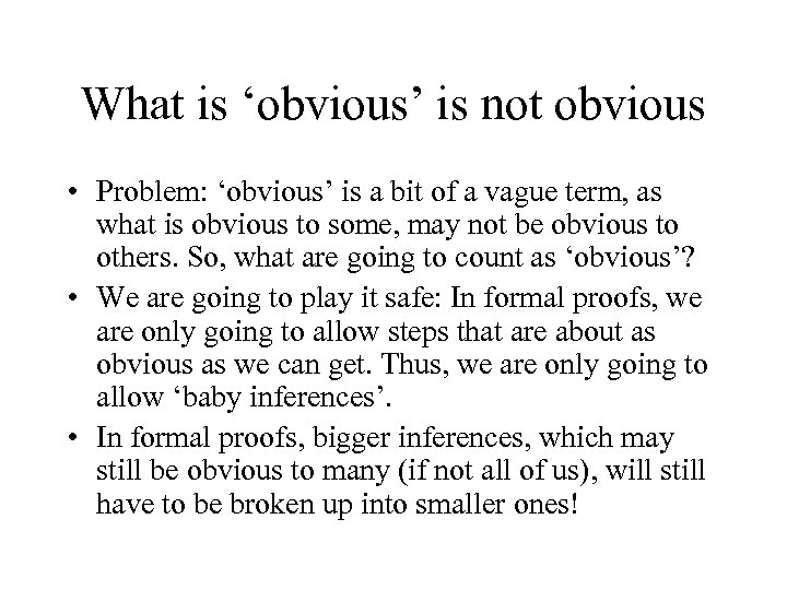What is ‘obvious’ is not obvious • Problem: ‘obvious’ is a bit of a vague term, as what is obvious to some, may not be obvious to others. So, what are going to count as ‘obvious’? • We are going to play it safe: In formal proofs, we are only going to allow steps that are about as obvious as we can get. Thus, we are only going to allow ‘baby inferences’. • In formal proofs, bigger inferences, which may still be obvious to many (if not all of us), will still have to be broken up into smaller ones!