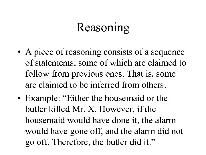 Reasoning • A piece of reasoning consists of a sequence of statements, some of which are claimed to follow from previous ones. That is, some are claimed to be inferred from others. • Example: “Either the housemaid or the butler killed Mr. X. However, if the housemaid would have done it, the alarm would have gone off, and the alarm did not go off. Therefore, the butler did it. ”