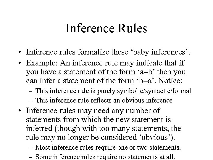 Inference Rules • Inference rules formalize these ‘baby inferences’. • Example: An inference rule may indicate that if you have a statement of the form ‘a=b’ then you can infer a statement of the form ‘b=a’. Notice: – This inference rule is purely symbolic/syntactic/formal – This inference rule reflects an obvious inference • Inference rules may need any number of statements from which the new statement is inferred (though with too many statements, the rule may no longer be considered ‘obvious’). – Most inference rules require one or two statements. – Some inference rules require no statements at all.