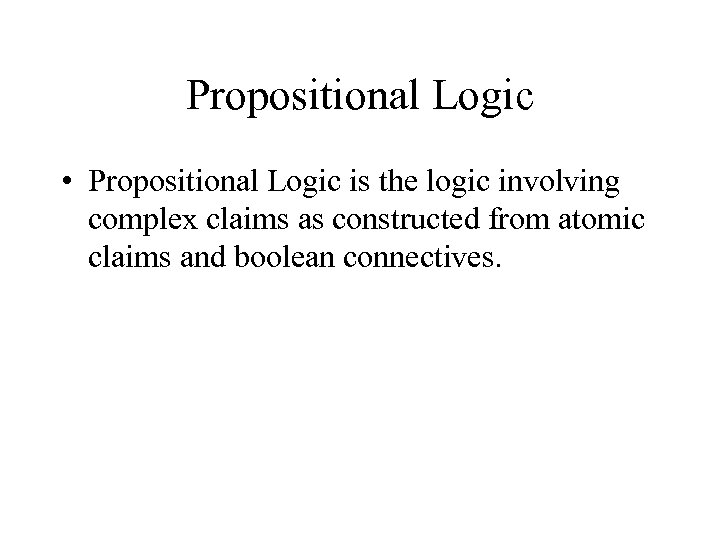 Propositional Logic • Propositional Logic is the logic involving complex claims as constructed from atomic claims and boolean connectives.