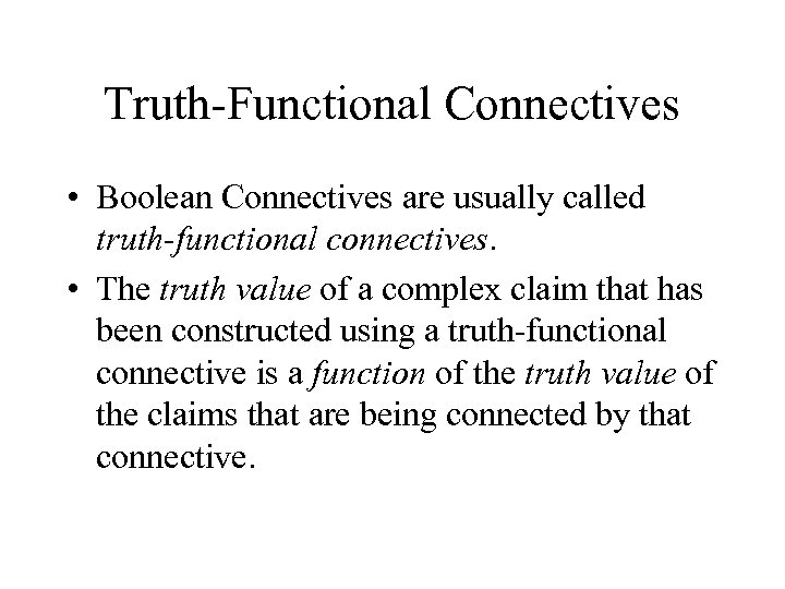 Truth-Functional Connectives • Boolean Connectives are usually called truth-functional connectives. • The truth value of a complex claim that has been constructed using a truth-functional connective is a function of the truth value of the claims that are being connected by that connective.