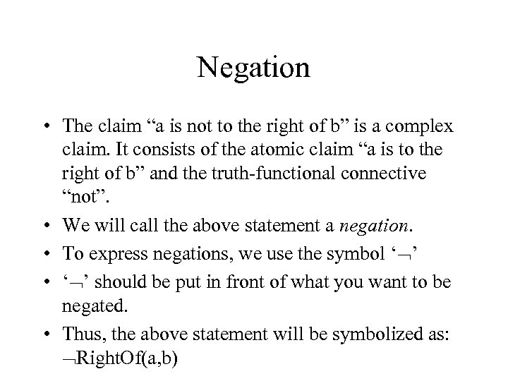 Negation • The claim “a is not to the right of b” is a complex claim. It consists of the atomic claim “a is to the right of b” and the truth-functional connective “not”. • We will call the above statement a negation. • To express negations, we use the symbol ‘ ’ • ‘ ’ should be put in front of what you want to be negated. • Thus, the above statement will be symbolized as: Right. Of(a, b)