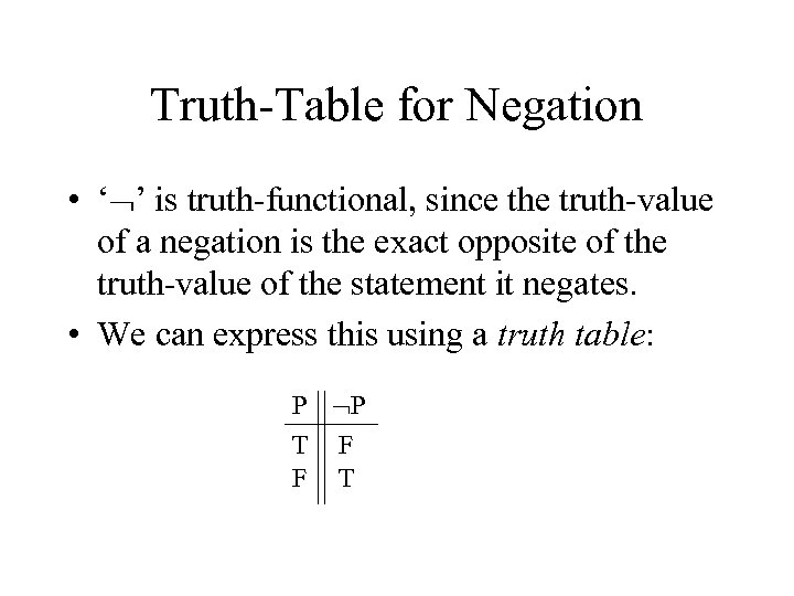 Truth-Table for Negation • ‘ ’ is truth-functional, since the truth-value of a negation is the exact opposite of the truth-value of the statement it negates. • We can express this using a truth table: P P T F F T