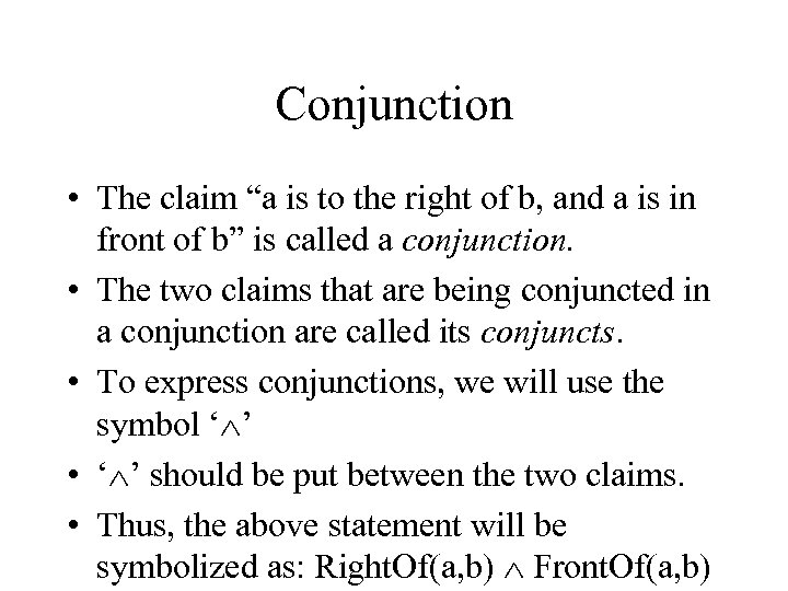 Conjunction • The claim “a is to the right of b, and a is in front of b” is called a conjunction. • The two claims that are being conjuncted in a conjunction are called its conjuncts. • To express conjunctions, we will use the symbol ‘ ’ • ‘ ’ should be put between the two claims. • Thus, the above statement will be symbolized as: Right. Of(a, b) Front. Of(a, b)