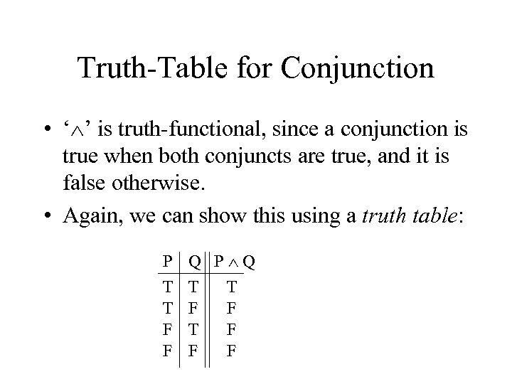 Truth-Table for Conjunction • ‘ ’ is truth-functional, since a conjunction is true when both conjuncts are true, and it is false otherwise. • Again, we can show this using a truth table: P T T F F Q P Q T T F F F