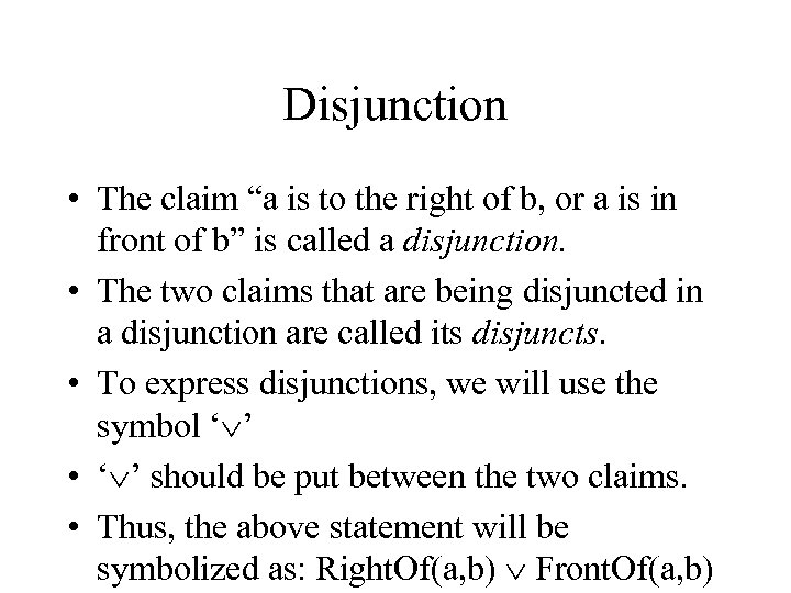 Disjunction • The claim “a is to the right of b, or a is in front of b” is called a disjunction. • The two claims that are being disjuncted in a disjunction are called its disjuncts. • To express disjunctions, we will use the symbol ‘ ’ • ‘ ’ should be put between the two claims. • Thus, the above statement will be symbolized as: Right. Of(a, b) Front. Of(a, b)
