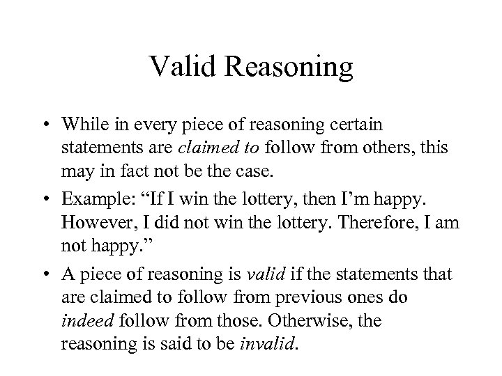 Valid Reasoning • While in every piece of reasoning certain statements are claimed to follow from others, this may in fact not be the case. • Example: “If I win the lottery, then I’m happy. However, I did not win the lottery. Therefore, I am not happy. ” • A piece of reasoning is valid if the statements that are claimed to follow from previous ones do indeed follow from those. Otherwise, the reasoning is said to be invalid.