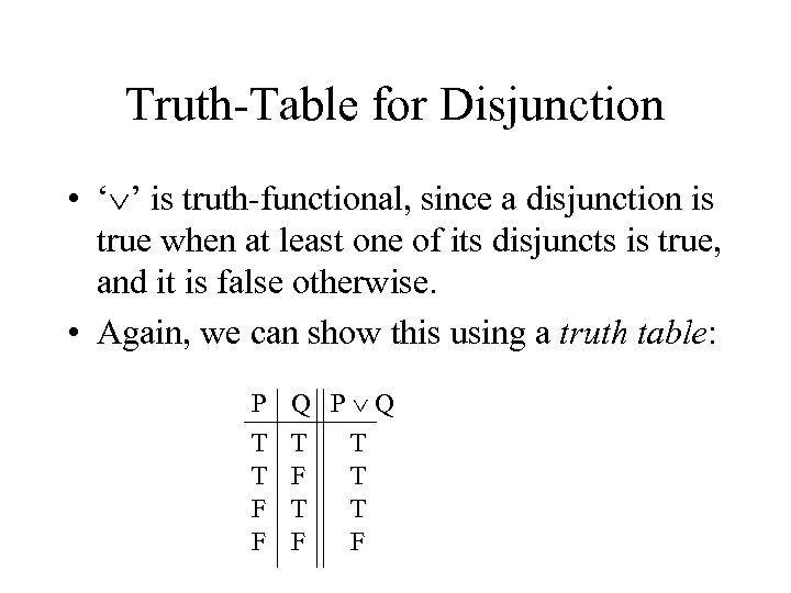 Truth-Table for Disjunction • ‘ ’ is truth-functional, since a disjunction is true when at least one of its disjuncts is true, and it is false otherwise. • Again, we can show this using a truth table: P T T F F Q P Q T T F T T T F F