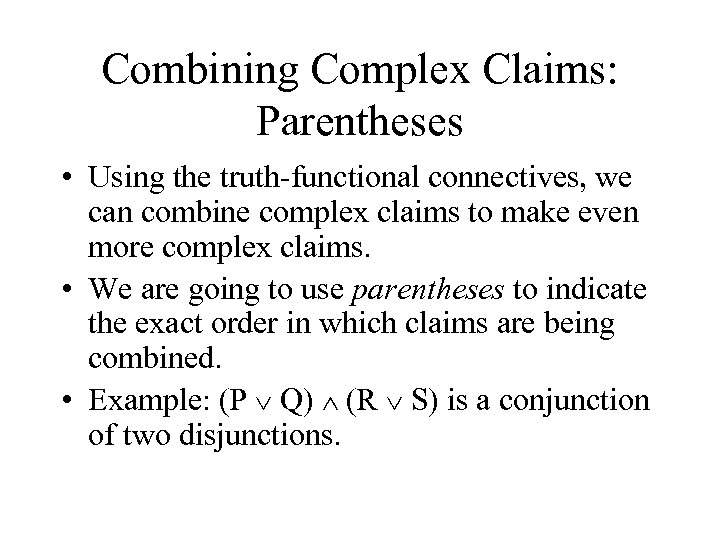 Combining Complex Claims: Parentheses • Using the truth-functional connectives, we can combine complex claims to make even more complex claims. • We are going to use parentheses to indicate the exact order in which claims are being combined. • Example: (P Q) (R S) is a conjunction of two disjunctions.