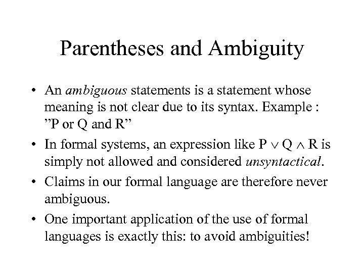 Parentheses and Ambiguity • An ambiguous statements is a statement whose meaning is not clear due to its syntax. Example : ”P or Q and R” • In formal systems, an expression like P Q R is simply not allowed and considered unsyntactical. • Claims in our formal language are therefore never ambiguous. • One important application of the use of formal languages is exactly this: to avoid ambiguities!